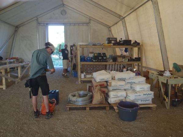 L'atelier, mis a disposition au début du chantier par MSF, a céder la place a une rubber hall, tente chapiteau a armature métallique. Ce déménagement a été l'occasion d'organiser au mieux le nouvel espace de travail et de faire un inventaire complet du matériel.